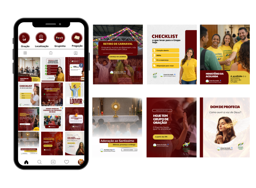 Chega de posts improvisados. Com este Pack de Artes prontas para Grupo de Oração RCC, você mantém o Instagram do grupo ativo, bonito e alinhado com a espiritualidade da Renovação Carismática Católica.