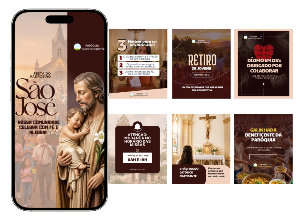 Pare de perder tempo criando posts do zero. Com o Pack para Paróquias, você tem artes prontas para divulgar missas, eventos e avisos com organização e profissionalismo.